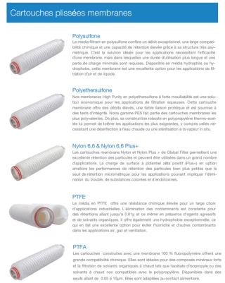 Les cartouches membranes sont la solution idéale pour les étapes de filtration particulaires, microbiennes et stérilisantes. De plus, leurs taux de rétention très élevés permettent l’élimination de contaminants particulaires et microbiens. Plusieurs options de matériaux (Polysulfone hydrophile ou hydrophobe, polyethersulfone, PTFE…) et seuils de filtration sont disponibles pour optimiser votre process de filtration dans un grand nombre d’industries (chimie, pharmaceutique, agro-alimentaire, cosmétique, traitement d’eau….) et dans un grand nombre d’applications (fabrication d’API, filtration de jus de fruits, solutions parentérales (LVP) , déminéralisation….). Elles sont généralement situées après une étape de filtration particulaire et avant conditionnement ou filtration de sécurité.