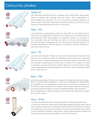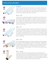 Les cartouches plissées sont des cartouches filtrantes composées d’un média filtrant plissé. Le média filtrant plissé des cartouches plissées augmente la surface de filtration qui, à son tour, augmente la capacité de charge et permet des débits plus élevés qu’avec une cartouche de profondeur. Les cartouches plissées Global Filter sont disponibles dans différents média filtrants (cartouches Polypropylène, cartouches fibre de verre, cartouches polyester…) pour une grande compatibilité chimique et une utilisation dans un grand nombre d’industries et d’applications. Elles sont la solution idéale pour une filtration particulaire efficace ou pour éviter un colmatage prématuré de cartouches membranes situées en aval. Notre gamme est disponible dans des efficacité absolues et nominales et dans des seuils de rétention allant de 0.2 à 50 microns.